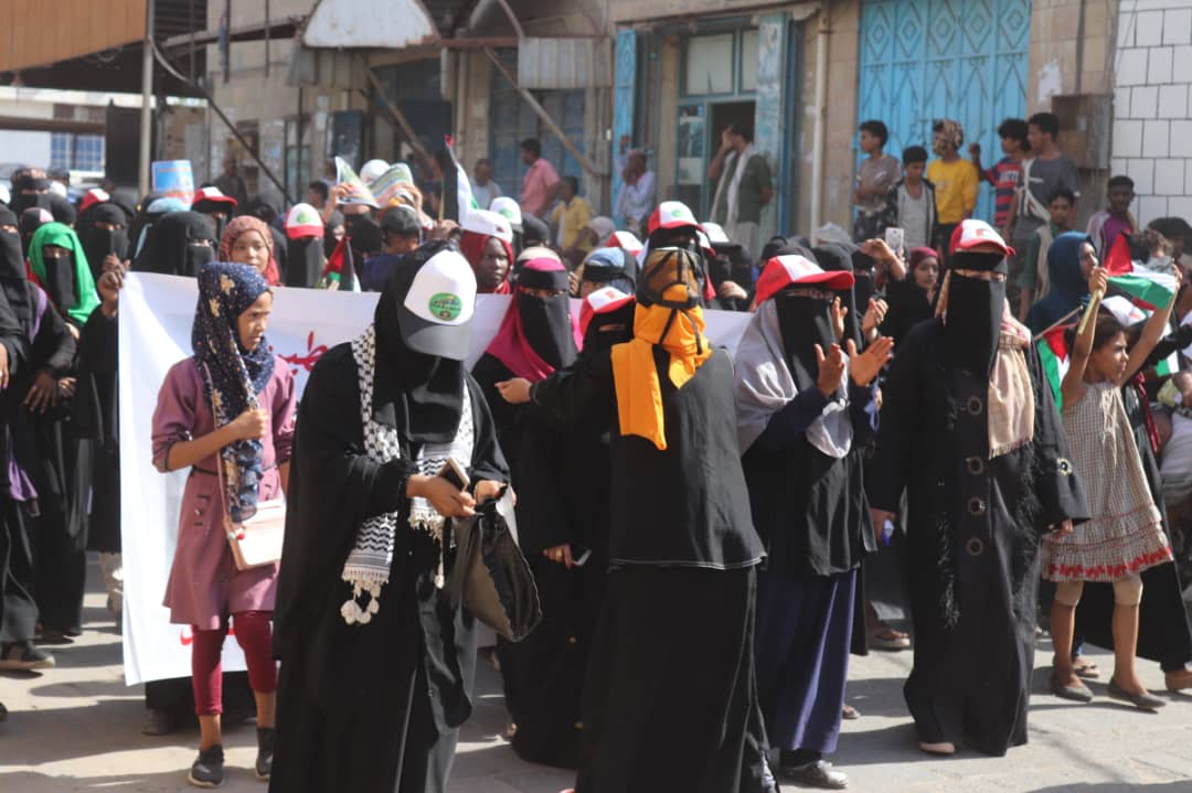 حيث خرج المئات من ابناء مديرية الحوطة وتبن حاملين العلم الفلسطيني ومرددين عدة شعارات وطنية عربية داعمة لشعباً سطر صموداً أمام اقوى ترسانه عسكرية بالشرق الأوسط .