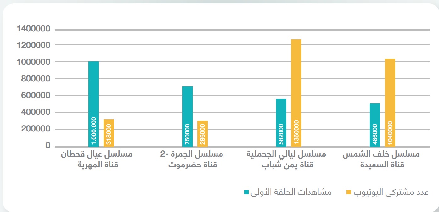 وأحرزت قناة المهرية المرتبة الأولى من خلال زيادة عدد المشتركين على يوتيوب في الفترة من ١ رمضان إلى ٧ شوال بنسبة ٧٠% ثم تليها قناة حضرموت ٢٤.٣٠% ، السعيدة ١١.٧٠% ، الهوية ١٠.١٠% ، يمن شباب ٩.٧٠% ، سهيل ٧.٢٠% ، الغد المشرق ٥%، بلقيس ٤.٨٠% .