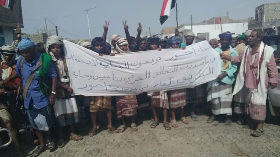 هذا وطاف المتظاهرون الشارع العام للمدينة مرددين الشعارات الغاضبة،وحاملين لافتات تٌعبّر عن رفض ابناء مديرية احور الشرفاء وكل أبناء المديرية تلك الجبايات الغير مشروعه التي فٌرضت على مالكي قواطر المشتقات النفطية، والشاحنات المحمّلة بالسلع الغذائية المارة بالمديرية