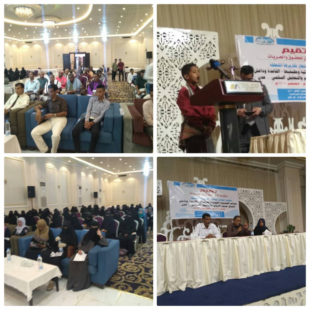 -ألقى المداخلات الثلاث كل من الخضر الميسري رئيس المنظمة، ومحمد ناصر العولقي محاضر في كلية زنجبار، وسعاد علوي رئيسة مركز عدن للتوعية من المخدرات..مأساة عدن في أثناء الغزو الحوثي،وبينت سطوراً حية من واقع المعاناة المرير لسكان مدينة عدن التي لازمتها رائحة الموت والبارود،وحولها الغرباء الغزاة إلى مدينة أشباح.