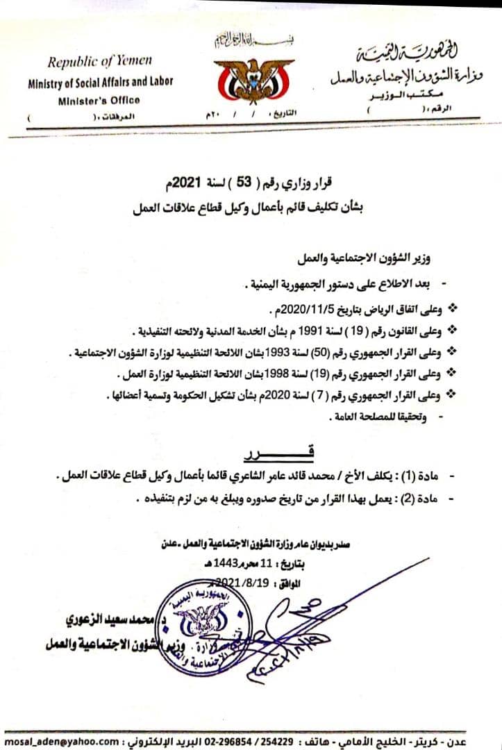 اصدر معالي الدكتور محمد سعيد الزعوري وزير الشؤون الإجتماعية والعمل في حكومة المناصفة اليوم قراراً وزارياً رقم 53 لعام 2021م بشأن تكليف قائم بأعمال وكيل قطاع علاقات العمل.