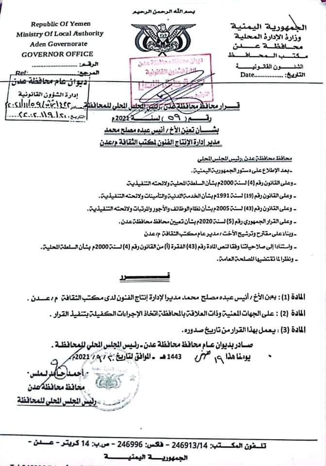 لعام 2021م والقاضي بتعيين الاخ انيس عبده مصلح محمد مدير لإدارة إنتاج الفنون في مكتب الثقافة بعدن اعتبارآ من تاريخ 20 سبتمبر 2021م وعلى الجهات المعنية وذات العلاقة في المحافظة اتخاذ الإجراءات الكفيلة لتنفيذ هذا القرار .