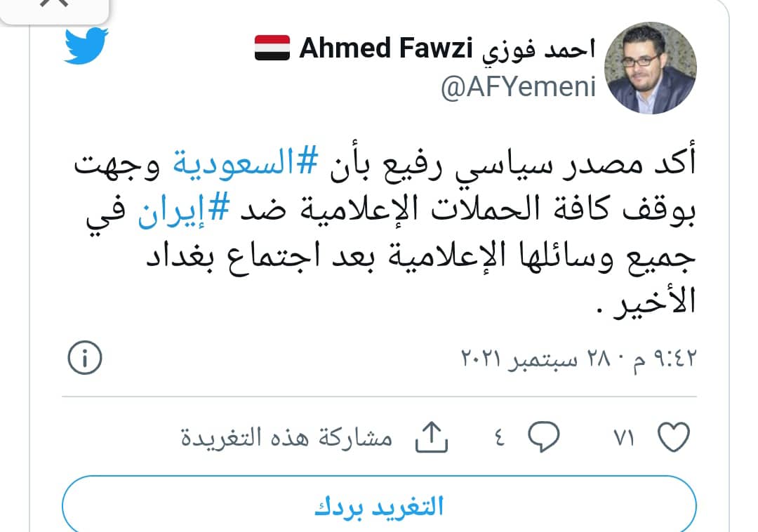 وقال الصحفي أحمد فوزي في تغريدة رصدها “يمن دايز” نقلا عن مصادر وصفها بالسياسية “أن السلطات السعودية وجهت كافة الجهات الاعلامية التابعة لها بوقف الحملات ضد إيران .