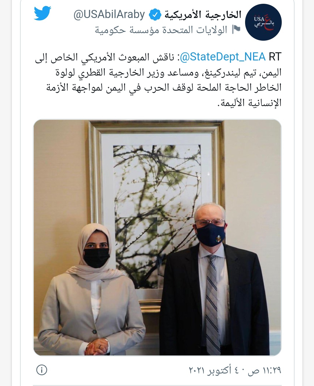 وقالت الخارجية الأمريكية -في تغريدة على تويتر- إن ليندركينغ ومساعد وزير الخارجية القطري لولوة الخاطر ناقشا الحاجة الملحة لوقف الحرب في اليمن لمواجهة الأزمة الإنسانية الأسوأ في العالم.