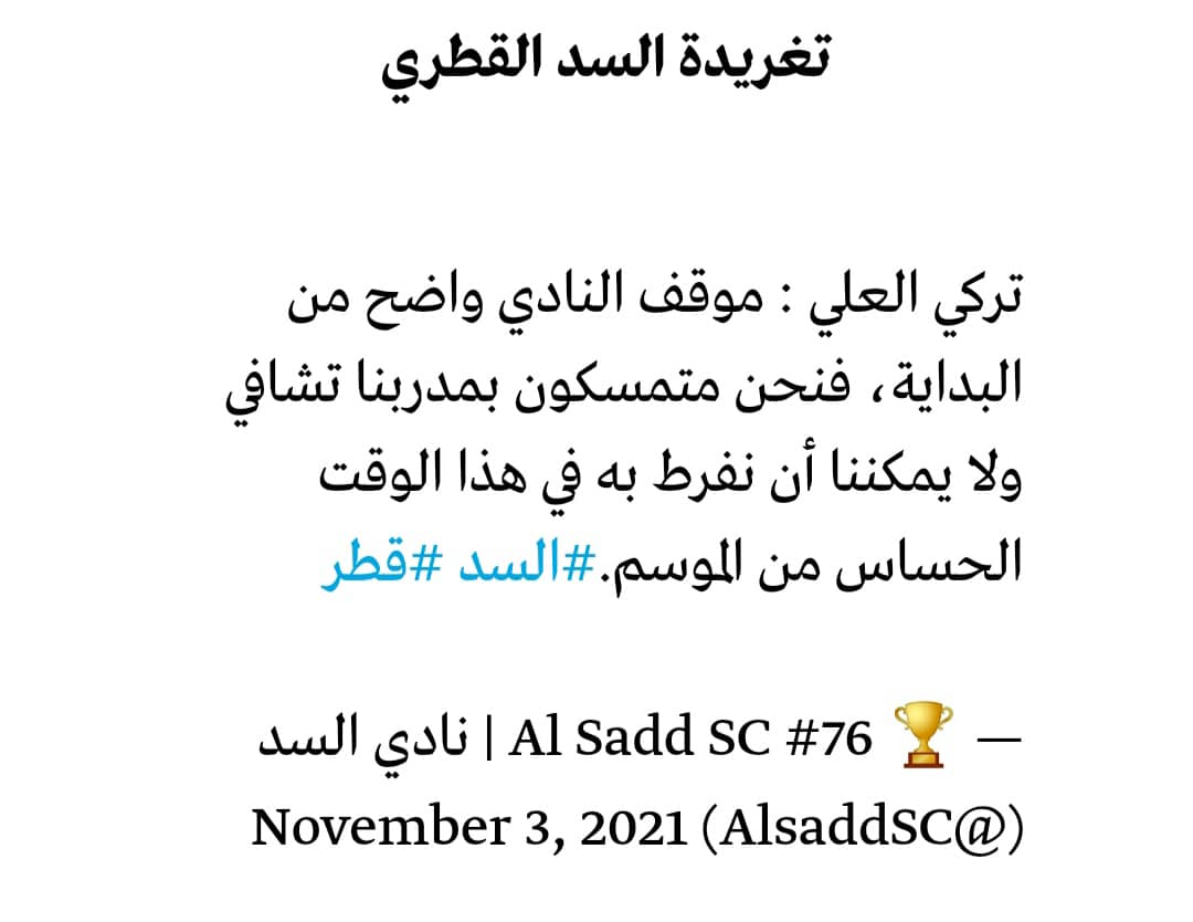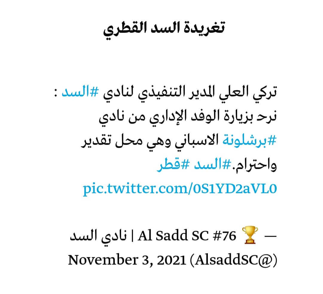وخلال حضور الوفد الإسباني مباراة السد والدحيل في الدوحة، نقل حساب السد على تويتر عن العلي قوله إن “موقف النادي واضح من البداية، فنحن متمسكون بمدربنا تشافي ولا يمكننا أن نفرط به في هذا الوقت الحساس من الموسم”. مؤكدا “نرحب بزيارة الوفد الإداري من نادي برشلونة الإسباني وهي محل تقدير واحترام”.