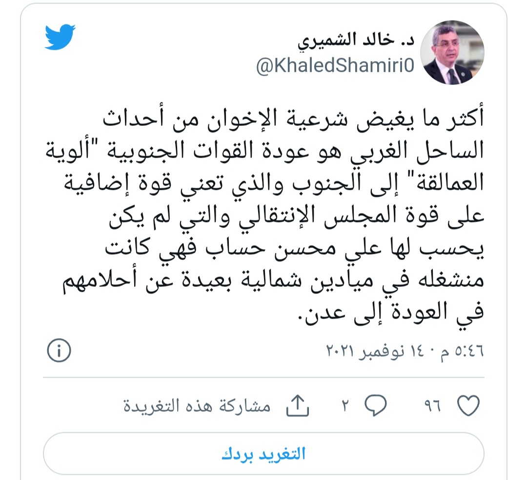 وقال رئيس مركز الدراسات السياسية، الدكتور، خالد الشميري، في تدوينة على تويتر، “أكثر ما يغيض شرعية الإخوان من أحداث الساحل الغربي هو عودة القوات الجنوبية “ألوية العمالقة” إلى الجنوب” .. مشيراً إلى أن هذا يعني قوة إضافية على قوة المجلس الإنتقالي الجنوبي التي لم يكن يحسب لها علي محسن حساب .