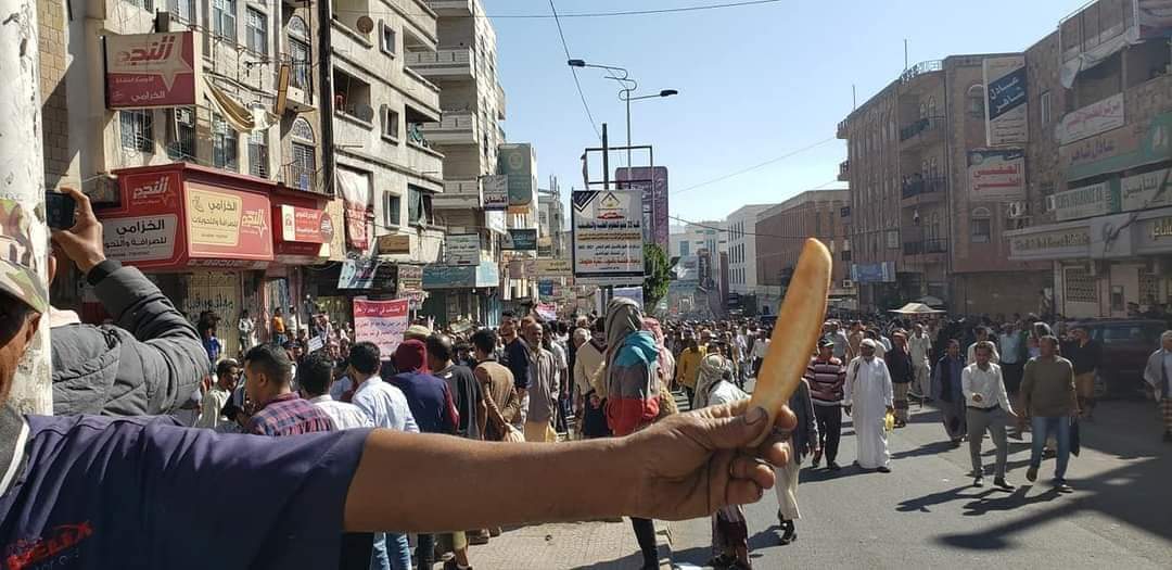 وتجمع المواطنون في شارع جمال قبل مدينة تعز ، رافعين الشعارات المنددة بالفساد والرافضة بما وصلت إليه المناطق المحررة في تعز ، مطالبين الحكومة والتحالف العربي والمجتمع الدولي التحرك سريعاً لوضع حد للإنهيار الاقتصادي الذي سيخلف أكبر مجاعة على وجه الأرض.