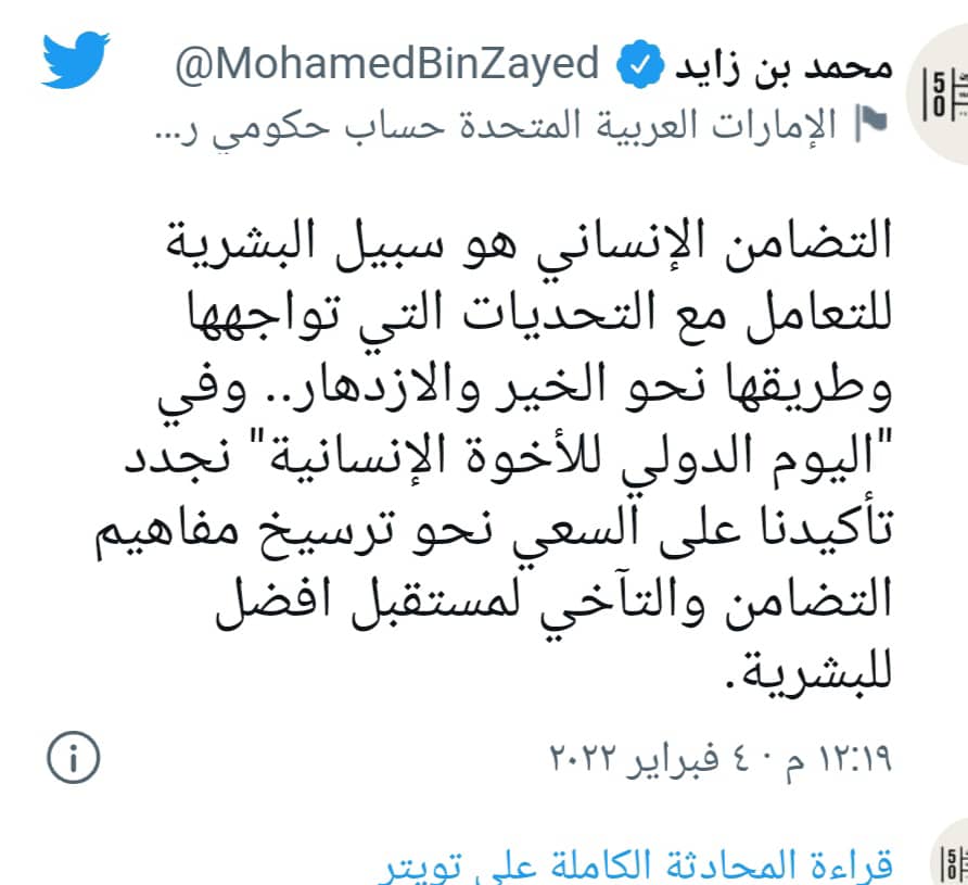 وأضاف الشيخ محمد بن زايد في تغريدة عبر حسابه الرسمي بموقع “تويتر”: “وفي “اليوم الدولي للأخوة الإنسانية” نجدد تأكيدنا على السعي نحو ترسيخ مفاهيم التضامن والتآخي لمستقبل افضل للبشرية”.