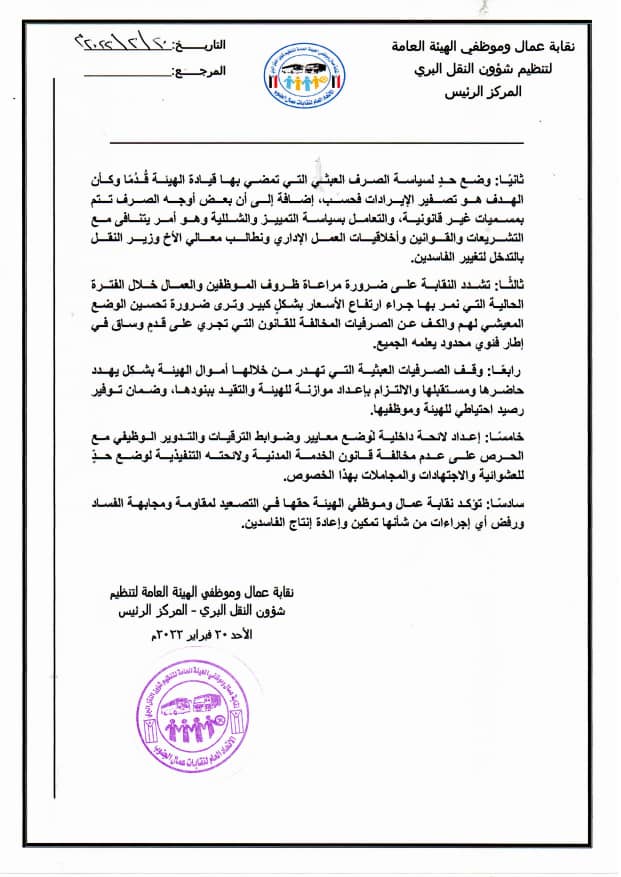 تعبر نقابة عمال وموظفي الهيئة العامة لتنظيم شؤون النقل البري عن رفضها الشديد لواقع الفساد والعبث الجاري الذي يهدد حاضر ومستقبل الهيئة ويضعها على شفير الإفلاس نتيجة الاختلالات المالية والإدارية التي تعاني منها، حيث يتم تمرير الفساد وصرف مبالغ بالملايين على أشياء وهمية، ومساعدات لأشخاص لاتربطهم صلة بالهيئة، وآخرين يصرف لهم مجاملة، وبصفة متكررة والصرف بسقف مفتوح دون أي التزام بموازنة وهو ما يتنافى مع القانون المالي والتشريعات الأخرى.