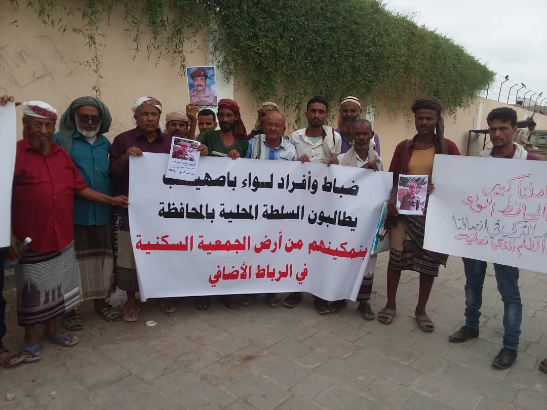 وفي الوقفة الاحتجاجية السلمية والتي تمت أمام بوابة مقر السلطة المحلية بمدينة الحوطة بلحج طالب المحتجون بتمكينهم من ارض الجمعية السكنية الواقعة في منطقة الرباط الإضافي والتي صرفت لهم بعام ١٩٩٣ م .