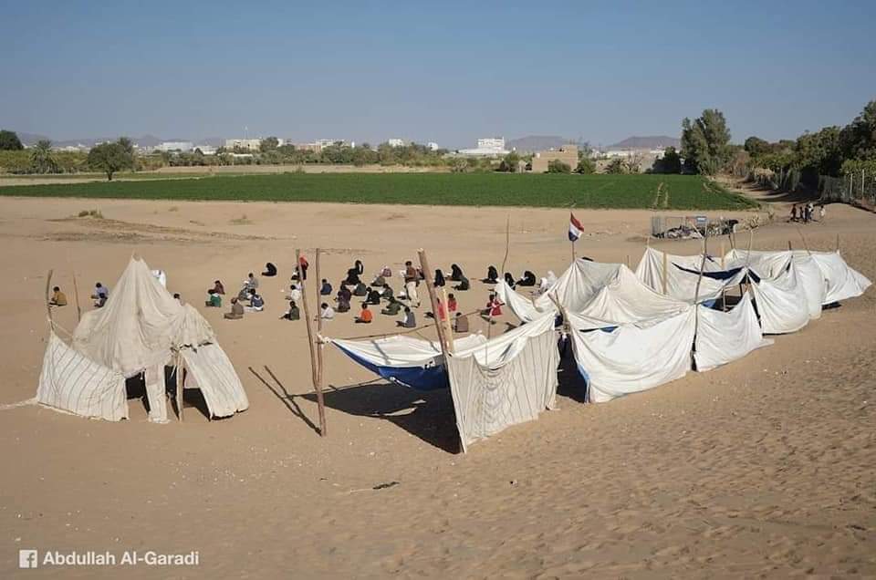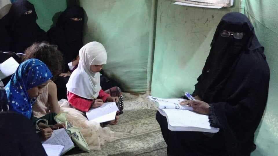 وفي السياق ذاته، شهدت مدينة سيئون في حضرموت ملحمة مأساوية تجسد أحد فصول الألم الدراسي، ففي مبادرة لافتة بطلتها المعلمة سعدية ثواب، وهي قصة نزوح بحد ذاتها، فقد نزحت بسبب الصراعات من محافظة حجة مروراً إلى الحديدة حتى وصلت سيئون، لتفتح سعدية “معلمةٍ” صغيرة تعلم فيها الأطفال والفتيات حتى يتمكنوا من مواجهة الحياة والقراءة والكتابة داخل خيمة تعليمية لتكون ملاذاً للنازحين في زمن الحرب، لمحو الأمية الخاص بالنازحات من مختلف الأعمار، تضم الخيم الصغيرة الممزقة 50 فتاة بينهن أم وعجوز مسنة تفترشان الأرض لتعليمهن أحرف اللغة العربية والنطق والكتابة في مراحل التدريس الأولى لمحو الأمية، في أوساط النازحات، حيث تشهد مدينة حضرموت أعداداً من نازحين وعائدين إلى أرض الوطن ما يشكلون ضغطاً على عملية الاستيعاب بالمدارس والثانويات.