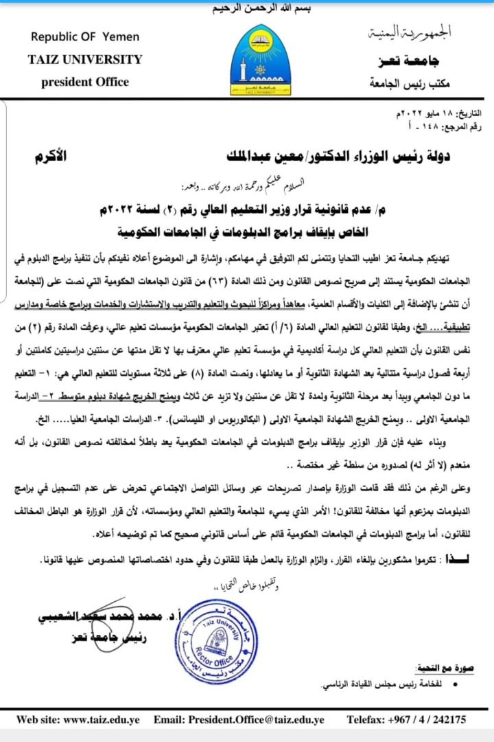 وأشار رئيس جامعة تعز إلى قيام الوزارة بإصدار تصريحات عبر وسائل التواصل الاجتماعي تحرض على عدم التسجيل في برامج الدبلومات بزعم أنها مخالفة للقانون، معتبراً ذلك إساءة للجامعة وللتعليم العالي ومؤسساته.