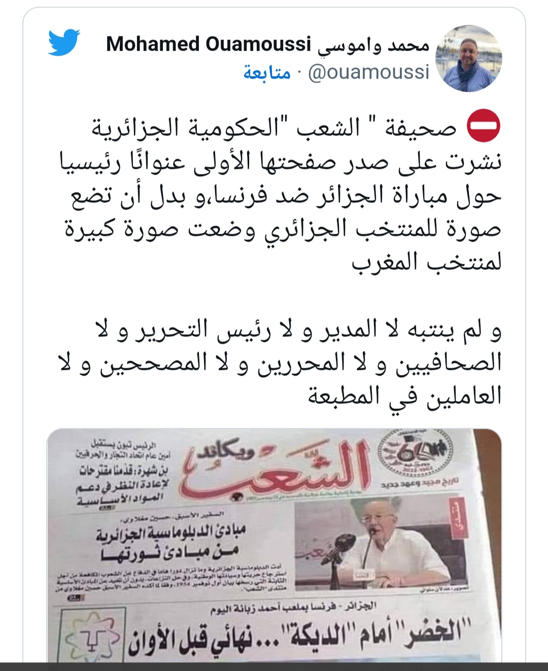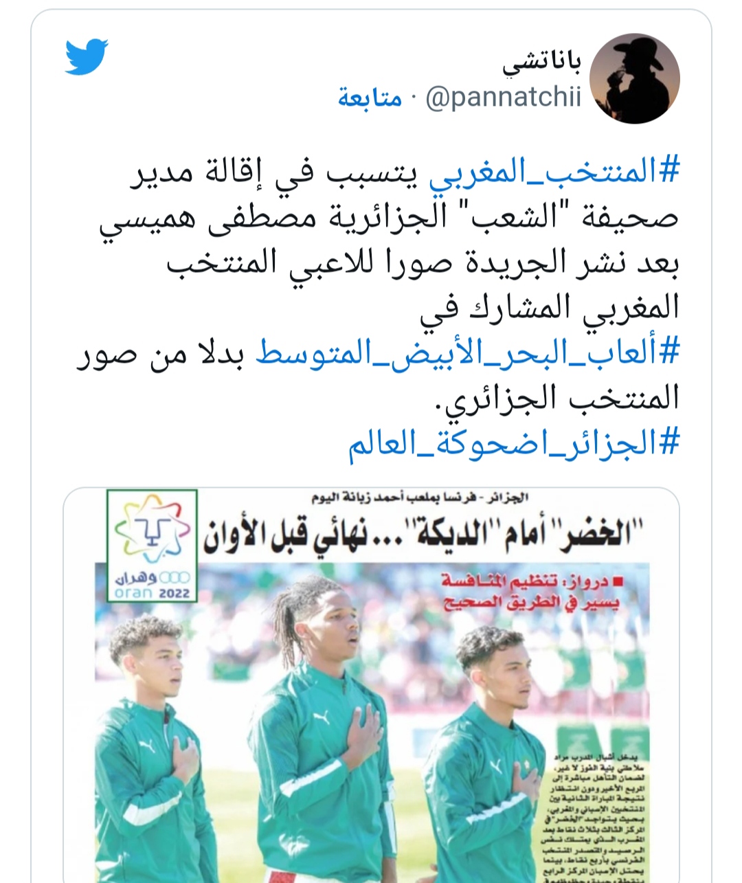 أقال وزير الاتصال بالجزائر مدير صحيفة الشعب الحكومية “لارتكابه خطأ فادحا” تمثل في وضع صورة منتخب المغرب بدل صورة منتخب الجزائر، بمناسبة مباراة الأخير مع فرنسا في ألعاب المتوسط.