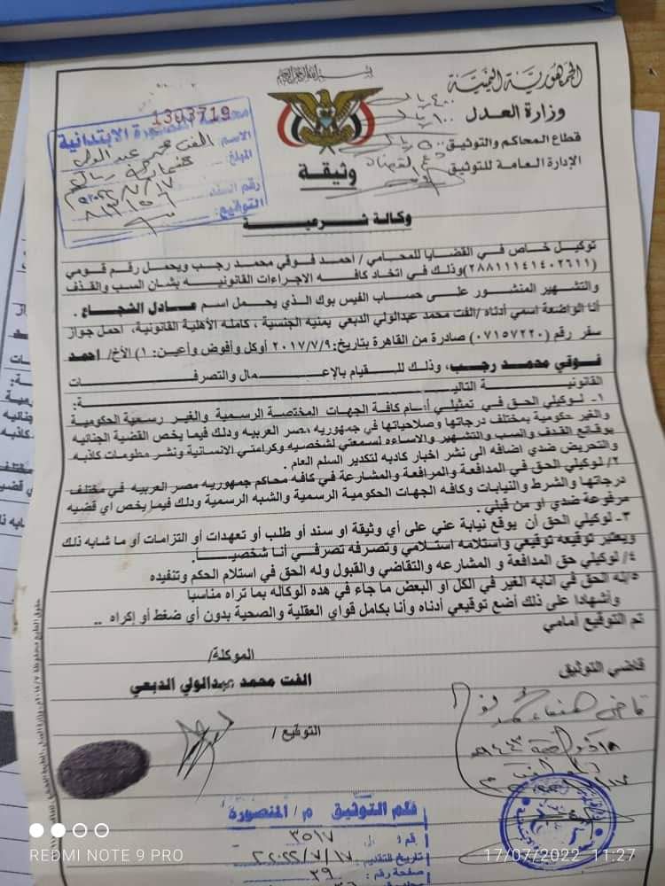 وأكدت الدبعي إلى أن وكيلها المحامي المصري “أحمد فوقي”، قد أنهى إجراءات توثيق المقالة بإجراءات قانونية، وقيد البلاغ برقم 19 أحوال بتاريخ 2 أغسطس الجاري، بإدارة مكافحة جرائم الحاسبات وشبكات المعلومات في مصر، مشيرة إلى أنه جاري تحديد إقامة الدكتور الشجاع من قبل الأجهزة الأمنية، ليتم إحالته للمحاكمة.