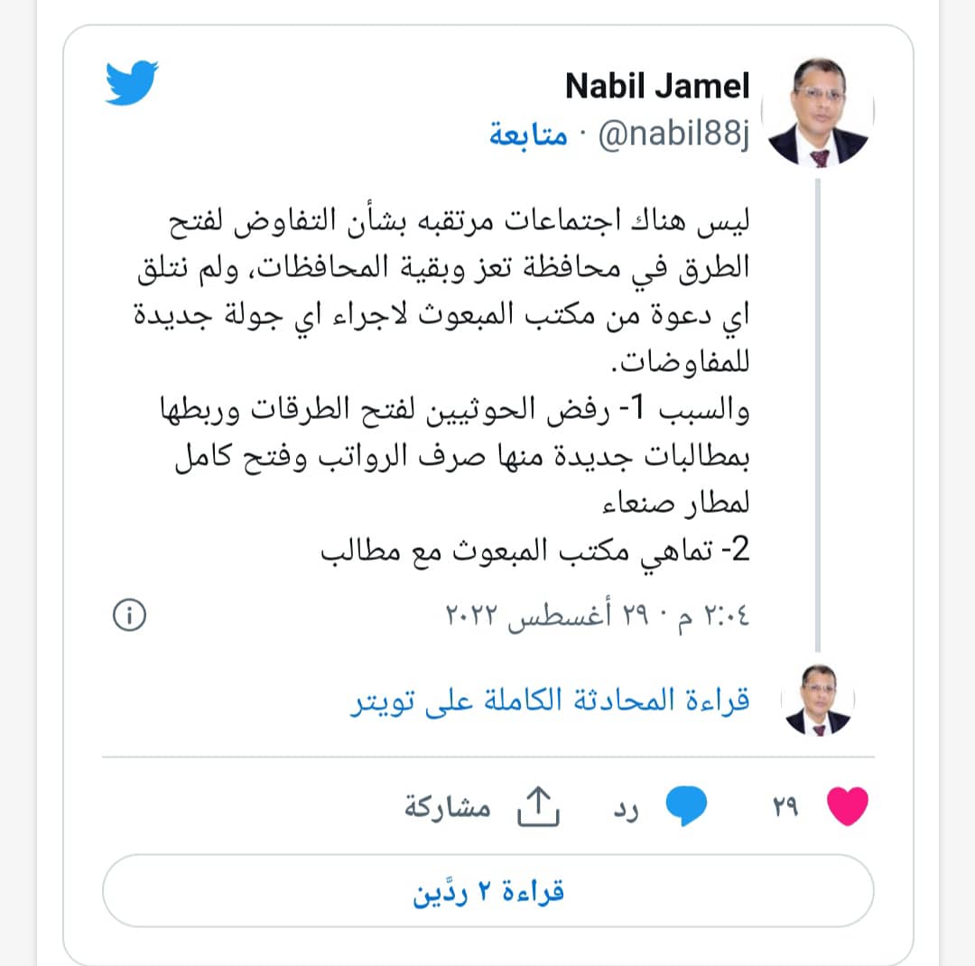 وقال جامل في تغريدات له على موقع تويتر، “ليس هناك اجتماعات مرتقبه بشأن التفاوض لفتح الطرق في محافظة تعز وبقية المحافظات، ولم نتلق اي دعوة من مكتب المبعوث لاجراء اي جولة جديدة للمفاوضات”.