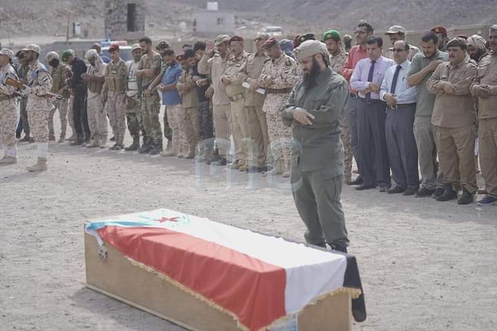 وشيع جثمان الشهيد الشوحطي بحضور اللواء عيدروس الزبيدي رئيس المجلس الانتقالي وبحضور قيادات من المجلس وعدد من القيادات العسكرية والأمنية.