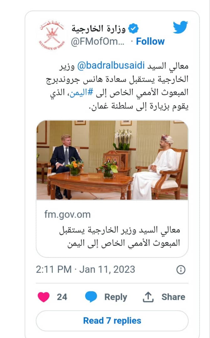 وفي هذا السياق استقبل وزير الخارجية العماني بدر البوسعيدي المبعوث الأممي إلى اليمن و”بحث معه المساعي المبذولة لتحقيق السلام، بما يلبي تطلعات اليمنيين في الأمن والاستقرار عبر عملية سياسية بمشاركة جميع الأطراف اليمنية ودعم المجتمع الدولي”، وفقا لمصادر إعلام عمانية رسمية، نقلت عن الوزير العماني “دعم بلاده لجهود التوصل إلى تسوية سياسية شاملة في اليمن”.