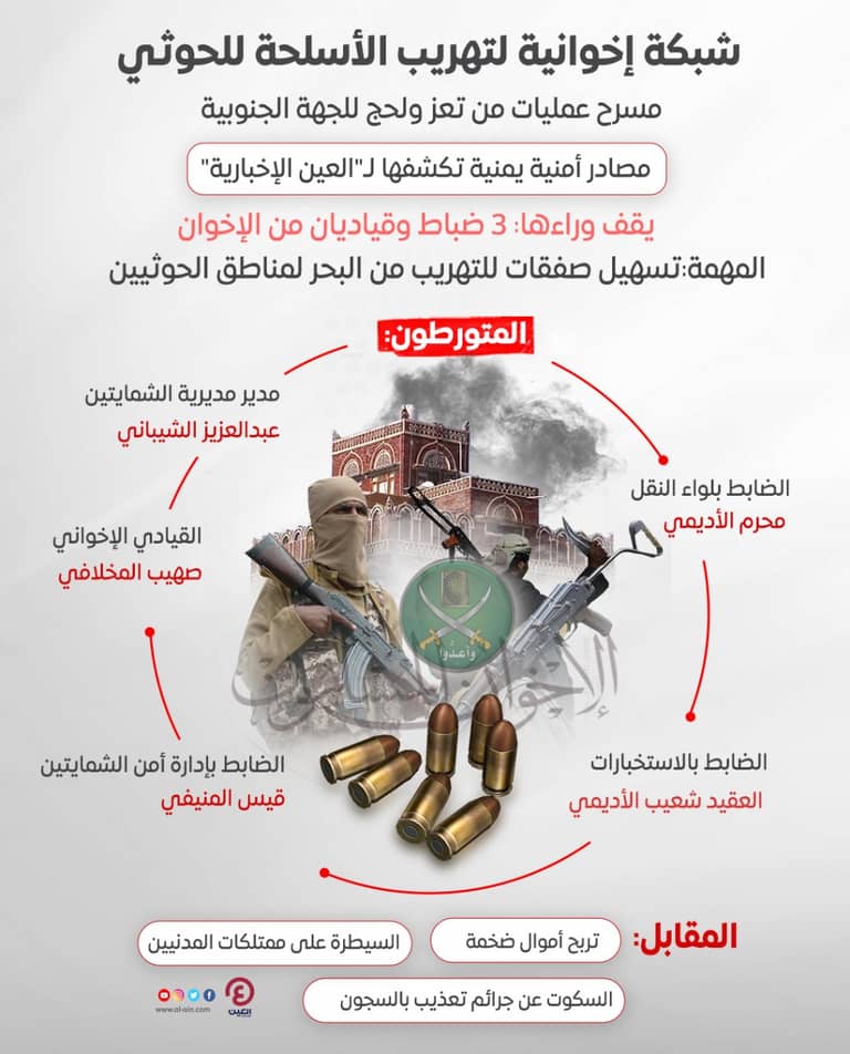 وطبقا للمصادر فإن ضابط الاستخبارات الإخواني العقيد شعيب الأديمي والذي يشغل منصب ركن استخبارات اللواء الرابع مشاة جبلي هو من يقود شبكة التهريب والتي تضم شقيقه “محرم الأديمي” وهو ضابط آخر في لواء النقل إلى جانب ضابط يدعى “قيس المنيفي” في إدارة أمن الشمايتين، فضلا عن قيادي إخواني رابع يدعى “صهيب المخلافي”.