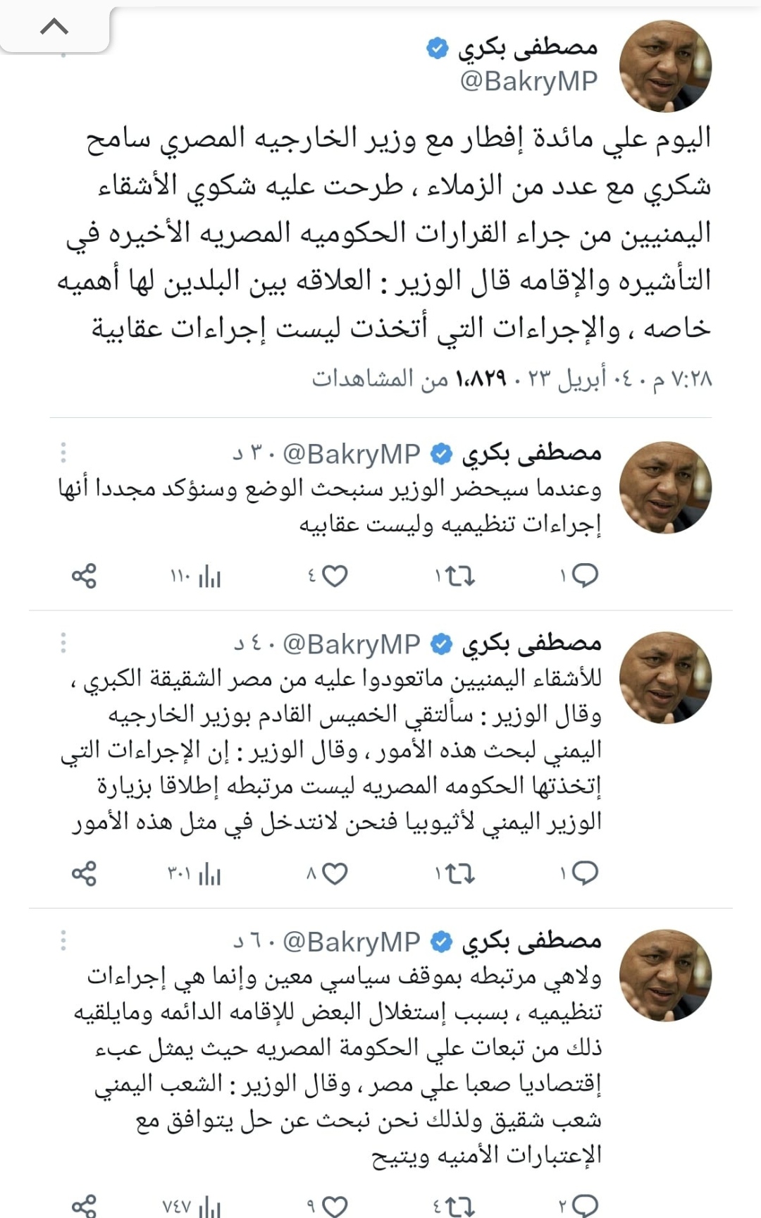 وأضاف «بكري»، في تغريدة عبر صفحته الرسمية عبر موقع التدوينات القصيرة «تويتر»، اليوم الثلاثاء، أن الوزير سامح شكري قال إن العلاقة بين مصر واليمن لها أهمية خاصة، مؤكدا أن الإجراءات التي اُتخذت ليست إجراءات عقابية.
