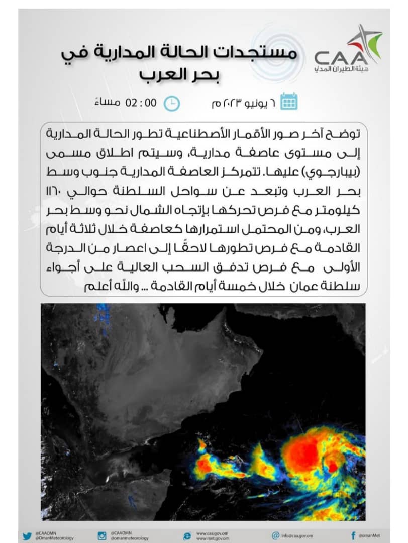 وقالت الهيئة في بيان صادر عنها إن حالة مدارية تطورت إلى مستوى عاصفة مدارية اطلق عليها “بيبارجوي” تتمركز جنوب وسط بحر العرب وتبعد عن سواحل السلطنة حوالي 1160 كيلومتر، مع فرص تحركها باتجاه الشمال نحو و سط بحر العرب.