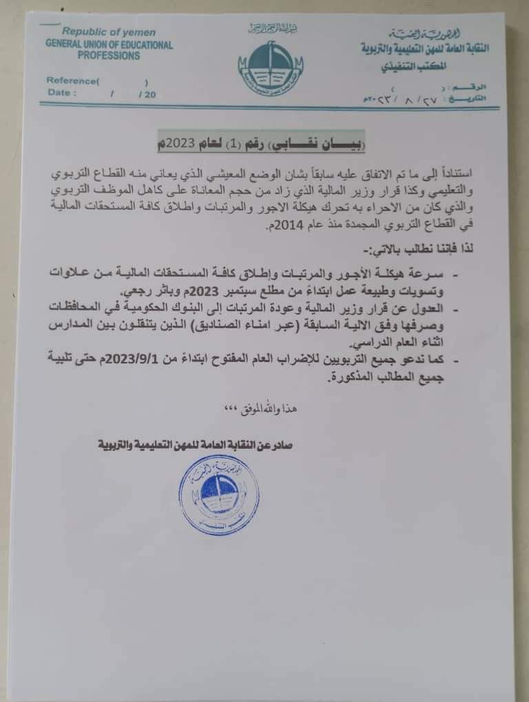 المكتب التنفيذي لنقابة المهن التعليمية والتربوية يصدر البيان رقم(1) لعام 2023م