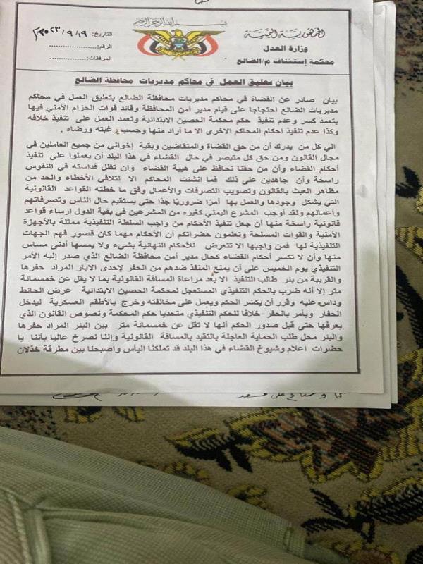 أعلن قضاة محاكم محافظة الضالع تعليق العمل بالمحاكم إحتجاجا على ممارسات قائد الحزام الأمني ألعميد أحمد قائد القبة مدير أمن الضالع لممارساتهم إلتي تهين السلطة القضائية وتعرقل تطبيق القوانين في محافظة. الضالع.