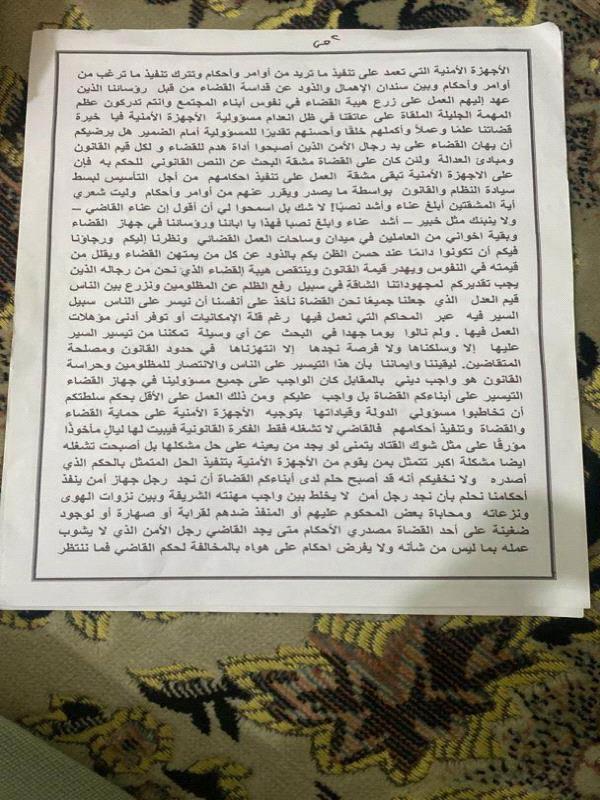 وأشار البيان المطول لقضاة الضالع إلى جملة من الممارسات إلتي تعرقل جهود القضاء من قبل قائد الحزام الأمني العميد أحمد قائد القبة، كما ناشدوا النائب العام والجهات القضائية والتنفيذية المسؤولة بإلزام قائد الحزام الأمني في الضالع بسرعة تنفيذ احكام القضاء مالم يتم.رفع الصفة الضبطية عنه.