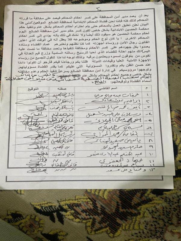 وتحدث بيان صدر اليوم الأربعاء والذي ذُيل بتوقيع رؤساء محاكم وقضاة الضالع حول تعمد قائد الحزام الأمَني ،مدير أمن المحافظة العميد القبة كسر أحكام القضاء ومساعدة بعض من صدرت ضدهم أحكام على مخالفتها وإهانة.السلطة القضائية في تصرف غريب ومتعمد هدفه تعطيل أعمال القضاء في المحافظة .