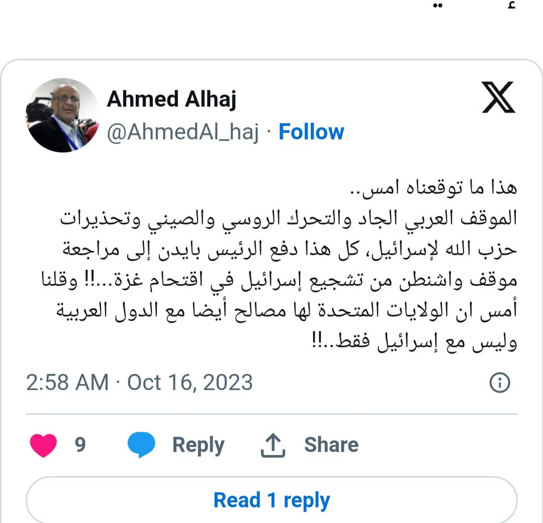 وأكد المراسل اليمني، أن الموقف العربي الجاد والتحرك الروسي والصيني وتحذيرات حزب الله لإسرائيل، كل هذا دفع الرئيس بايدن إلى مراجعة موقف واشنطن من تشجيع إسرائيل في اقتحام غزة… مشيرًا إلى أن الولايات المتحدة لها مصالح أيضا مع الدول العربية وليس مع إسرائيل فقط، حسب تعبيره.