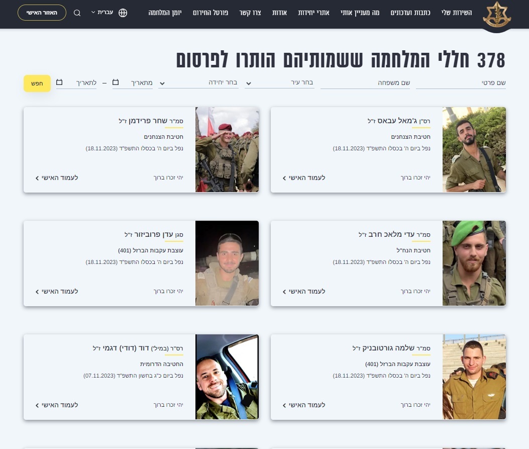كما نشرت الدفاع الإسرائيلية صور وأسماء جنودها وضباطها القتلى على موقعها الرسمي .