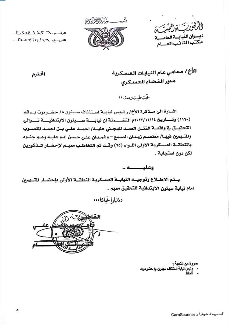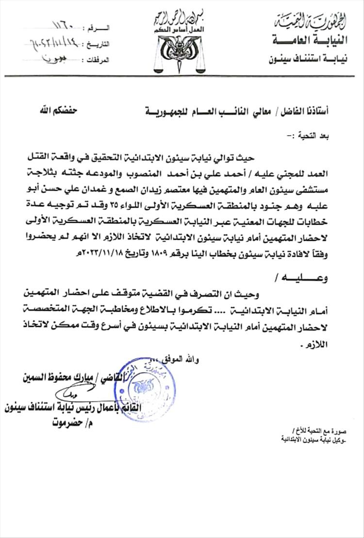 يأتي ذلك بعد توجية مذكرة من نيابة استئناف سيئون انه تم التوجيه عدة خطابات عبر النيابة العسكرية بالمنطقة لاحضار المتهمين بالقتل العمد على المجني عليه احمد علي بن علي المنصوب المودعة جثته ثلاجة مستشفى سيئون والمتهمين فيها معتصم زيدان الصمع و غمدان علي حسن وهم جنود بالمنطقة العسكرية الاولى.