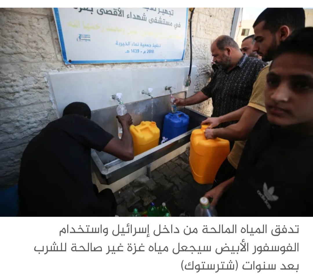 وحدد حينها الفريق البحثي بقيادة عالم الكيمياء الجيولوجية أفنير فينغوش من جامعة بن غوريون في بئر السبع؛ حلا لتلك المشكلة يمكن أن يأتي من داخل إسرائيل، في إطار ما يعرف بـ”دبلوماسية العلوم”. غير أن “طوفان الأقصى” يوم السابع من أكتوبر/تشرين الأول الماضي، جاء ليضيف سببا جديدا يُخرج مياه قطاع غزة من الخدمة قبل خمسة أعوام من الموعد الذي حددته الدراسة، وذلك عبر تسميمها بالفوسفور الأبيض، والذي استخدمته إسرائيل في هذه الحرب بكثافة فاقت الحروب السابقة.