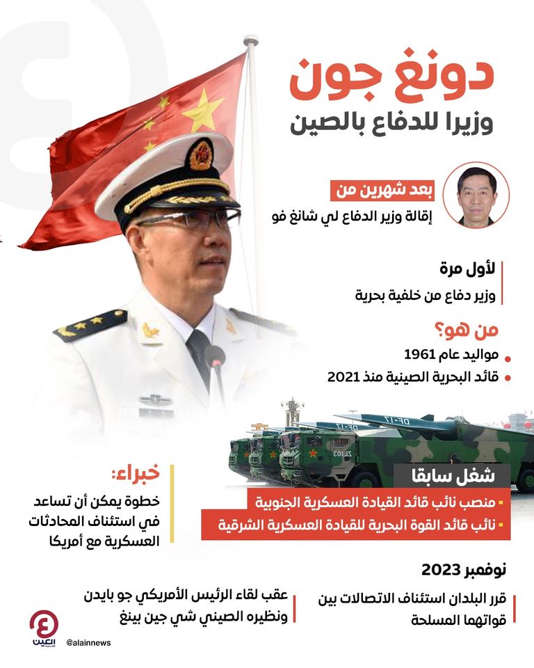 في خطوة ربما تمهد الطريق أمام علاقات عسكرية أفضل مع أمريكا، عينت الصين دونغ جون وزيرا للدفاع، ليحل محل لي شانغ فو.