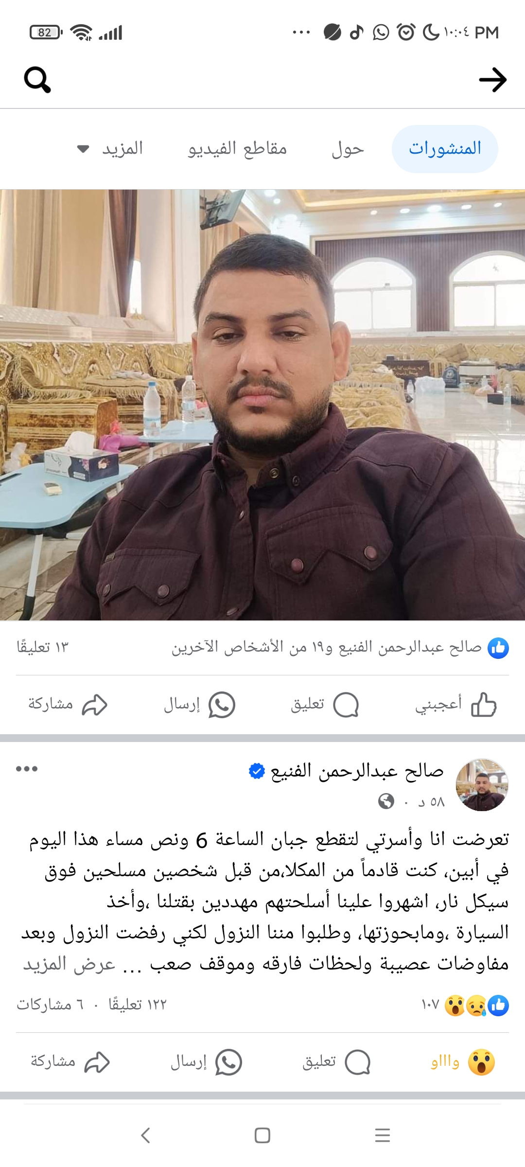 وقال المواطن صالح عبدالرحمن الفنيع في منشور على صفحته بالفيس بوك أنه تعرض هو وأسرته لحادثة تقطع مسلح في تمام الساعة 6 مساء على خط أبين كونه كان قادما من المكلا .