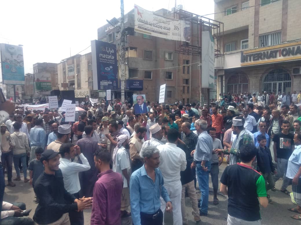 وردد المتظاهرون هتافات مؤيدة لقرارات البنك المركزي ومنددة بموقف المبعوث الاممي لليمن هانس غرندبنج .