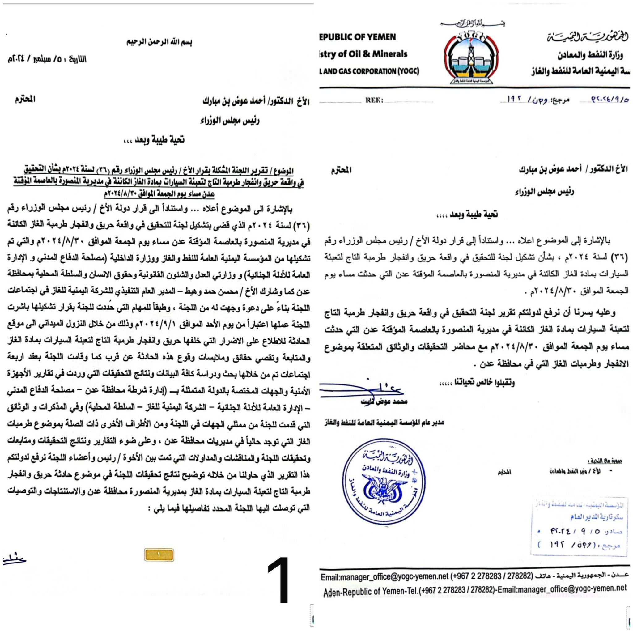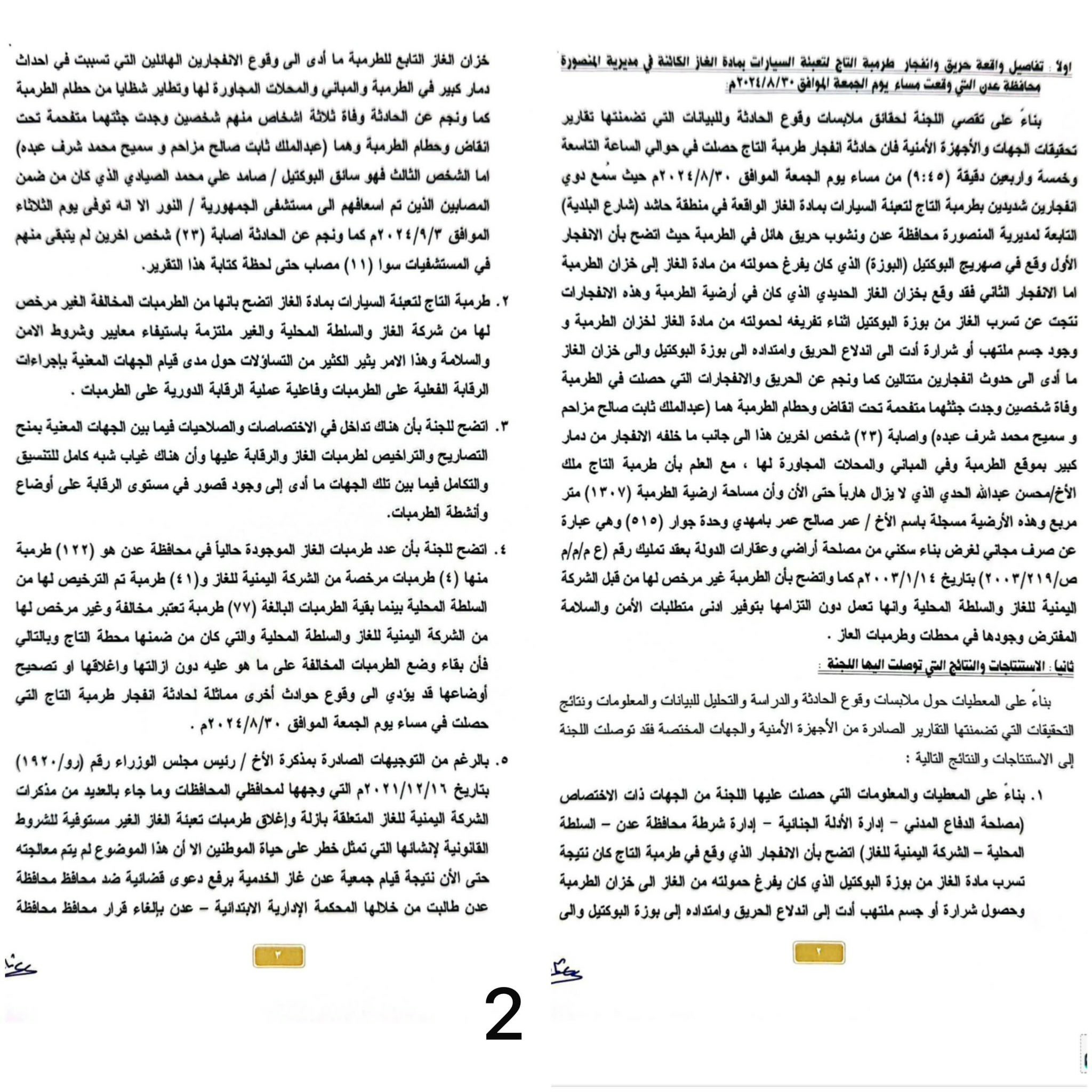 كشف تقرير حكومي حديث نشره رئيس مجلس الوزراء أحمد عبيد بن مبارك إن انفجار محطة الغاز في عدن كان بسبب تسرب مادة الغاز من بوزة البوكتيل وحصول شرارة ولهب أدى للانفجار.