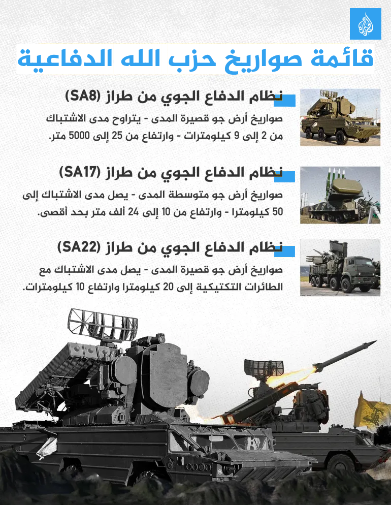 تشمل منظومة حزب الله الدفاعية صواريخ أرض-جو تكتيكية قصيرة المدى تعمل على ارتفاعات منخفضة من طراز (SA8)، وهو نظام دفاع صاروخي متنقل يشمل مركبات كبيرة سداسية العجلات، ومنصات إطلاق محسنة بإمكانها حمل ستة صواريخ، كما أنه معزز بثلاثة أنظمة من الرادارات: نظام مراقبة من طراز (H-BAND) بيضاوي الشكل يصل مداه إلى 30 كيلومترا، ونظام رادار نبضي للتعقب من طراز (J-BAND) يبلغ أقصى نطاق تتبع له نحو 20 كيلومترا، ورادار التوجيه من طراز (I-BAND) الذي بإمكانه توجيه صاروخين إلى هدف واحد.