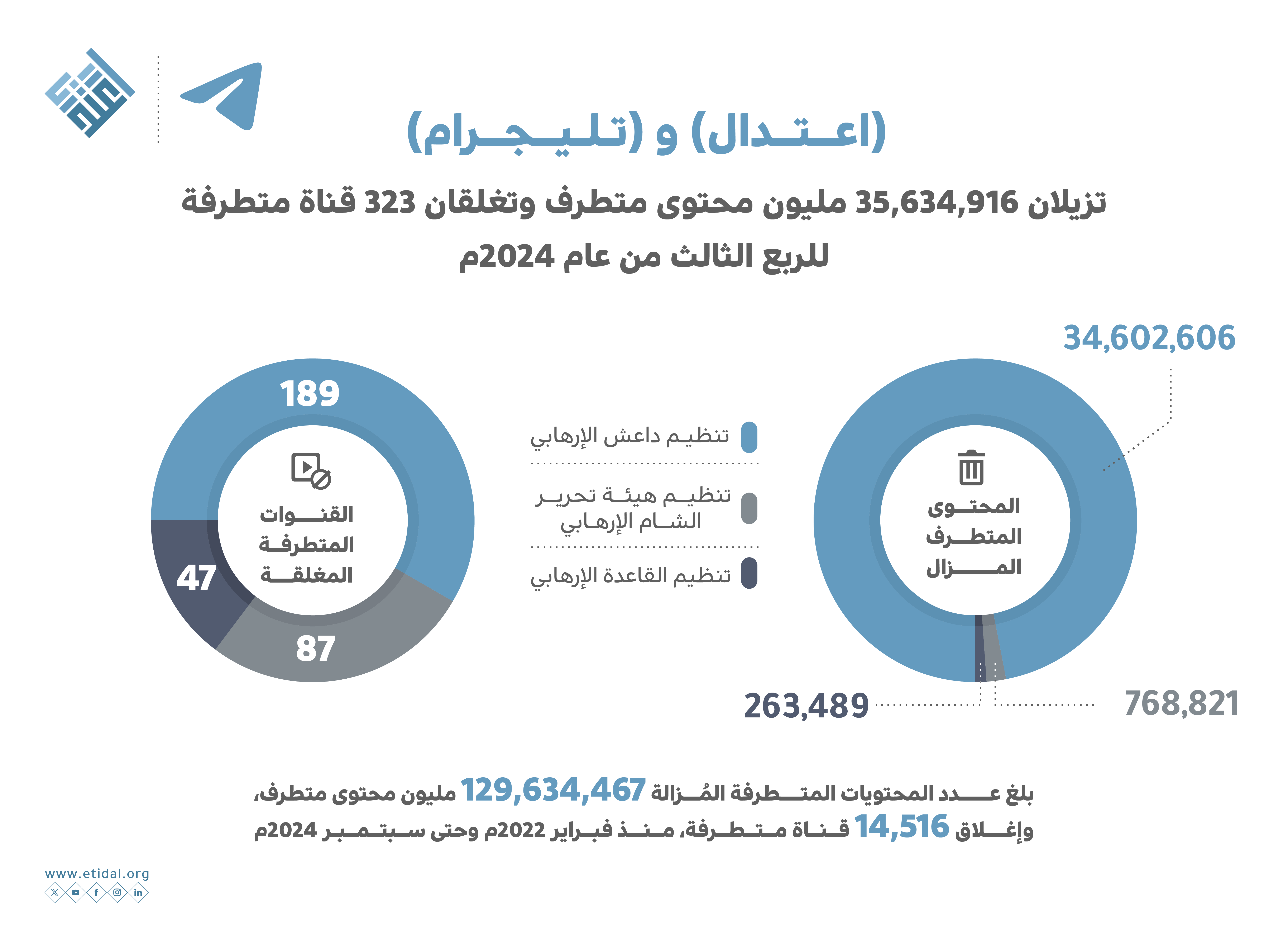 وتمكنت الفرق المشتركة، خلال الربع الثالث من العام الحالي، من رصد وإزالة النشاط الدعائي لثلاثة تنظيمات إرهابية هي: «داعش» و«هيئة تحرير الشام» و«القاعدة»، بإجمالي قدره 35 مليوناً و634 ألفاً و916 محتوى متطرفاً، وإغلاق 323 قناة متطرفة، حيث تصدّر تنظيم «داعش» الإرهابي المنشورات المزالة بـ34 مليوناً و602 ألف و606 محتويات متطرفة، و189 قناة متطرفة أُغلقت. تلاه تنظيم «هيئة تحرير الشام» الإرهابي بإزالة 768 ألفاً و821 محتوى متطرفاً وإغلاق 87 قناة متطرفة. فيما تذيَّل تنظيم «القاعدة» الإرهابي قائمة المحتويات المتطرفة المزالة بـ263 ألفاً و489 محتوى متطرفاً وبـ47 قناة متطرفة أُغلقت.