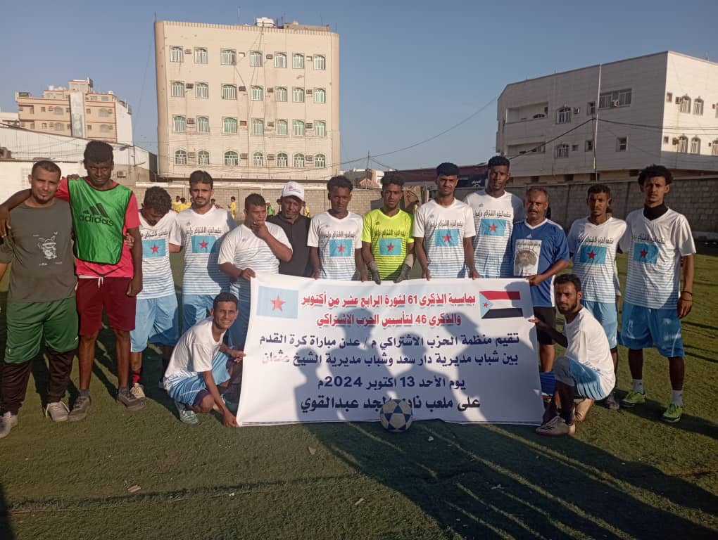 التقى عصر امس الأحد ١٣ أكتوبر فريق اشتراكي مديرية دار سعد لكرة القدم بفريق اشتراكي مديرية الشيخ عثمان في مباراة ودية أقيمت برعاية منظمة الحزب الاشتراكي م/عدن بمناسبة احتفالات شعبنا بعيد ثورة الرابع عشر من أكتوبر الخالدة في ذكراها الـ61، واحتفاءً بذكرى تأسيس الحزب الاشتراكي الـ46.