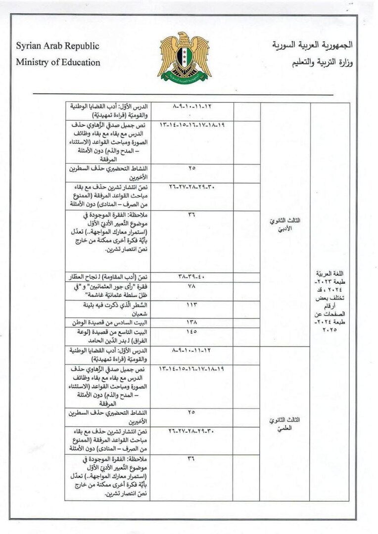 ووصلت التعديلات في الصف الثالث الثانوي العلمي إلى حذف الوحدة الكاملة المتعلقة بـ”أصل وتطور الحياة” وحذف فقرة “تطور الدماغ” بالكامل من مادة العلوم، وأما مادة اللغة العربية فقد شهدت حذف نص “حماة الديار”.