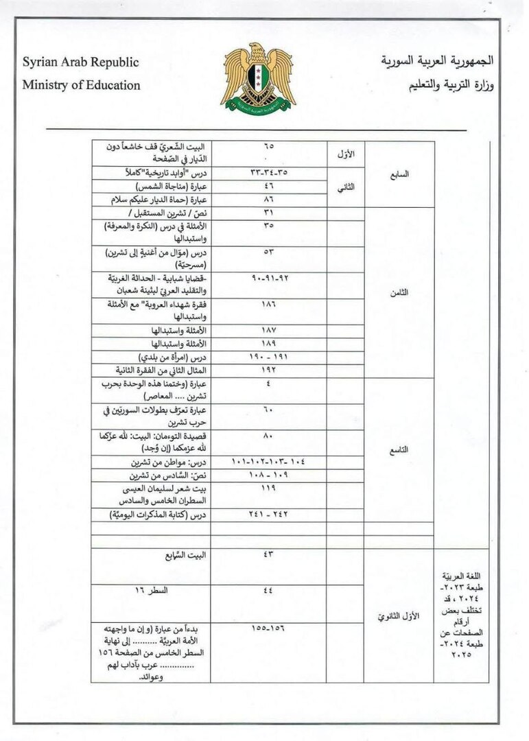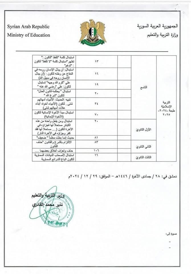وأيضا حذف رموز النظام السوري السابق وإلغاء مادة ” التربية القومية”، والفقرات المتعلقة بـ “حرب تشرين التحريرية”، بالإضافة إلى الصور والرسومات المتعلقة بها.