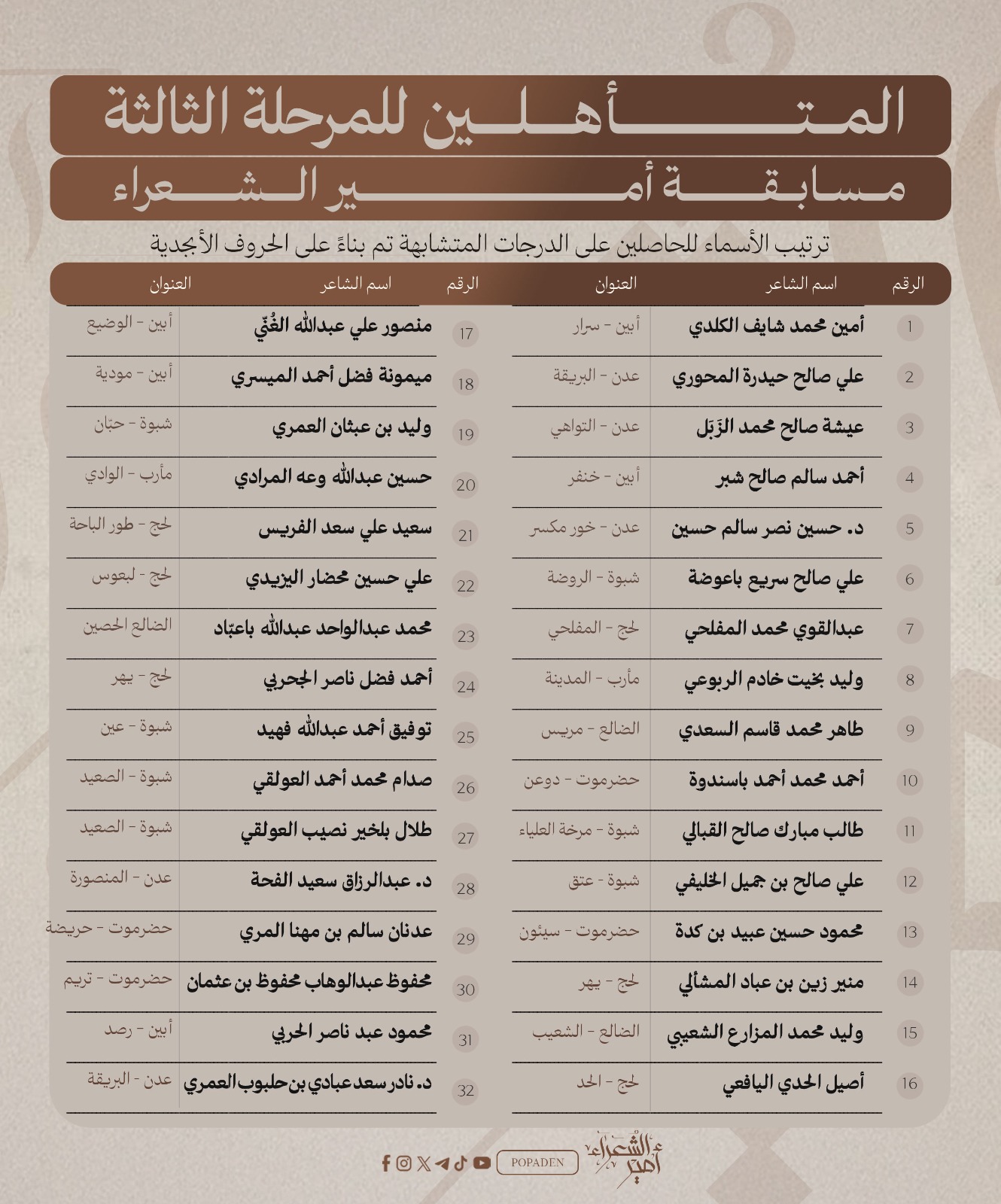 أعلنت لجنة تحكيم “مسابقة أمير الشعراء” في عدن عن تأهل 32 شاعراً إلى المرحلة الثالثة من المسابقة، بعد جولة تنافسية قوية جمعت 64 شاعراً من مختلف المناطق المحررة في اليمن، وسط مشاركة شعرية واسعة وثرية.