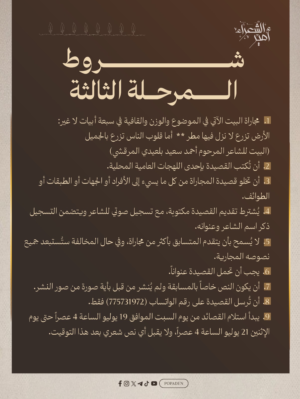 ونشرت لجنة تحكيم مسابقة أمير الشعراء شروطاً جديدة للمرحلة الرابعة، التي سيخوض فيها المتأهلون منافسة “المجاراة على بيت شعري للشاعر الراحل أحمد سعيد بلعيدي المرقشي، بهدف اختيار أفضل 16 شاعراً فقط، للتأهل إلى المرحلة الرابعة الحضورية الكبرى، التي ستُقام في العاصمة عدن.