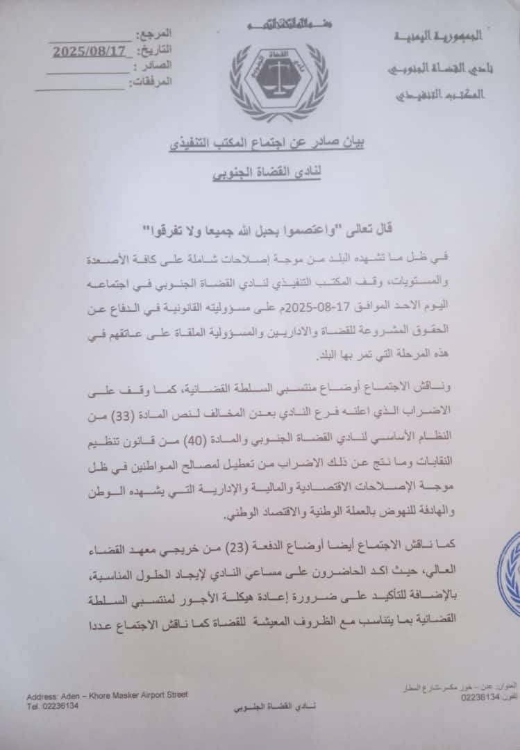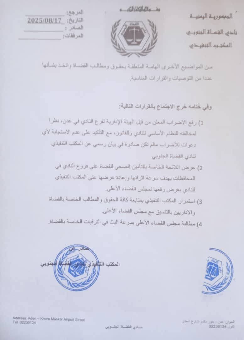 (1) رفع الاضراب المعلن من قبل الهيئة الإدارية لفرع النادي في عدن، نظرا لمخالفته للنظام الأساسي للنادي وللقانون، مع التأكيد على عدم الاستجابة لأي دعوات للأضراب مالم تكن صادرة في بيان رسمي عن المكتب التنفيذي لنادي القضاة الجنوبي.