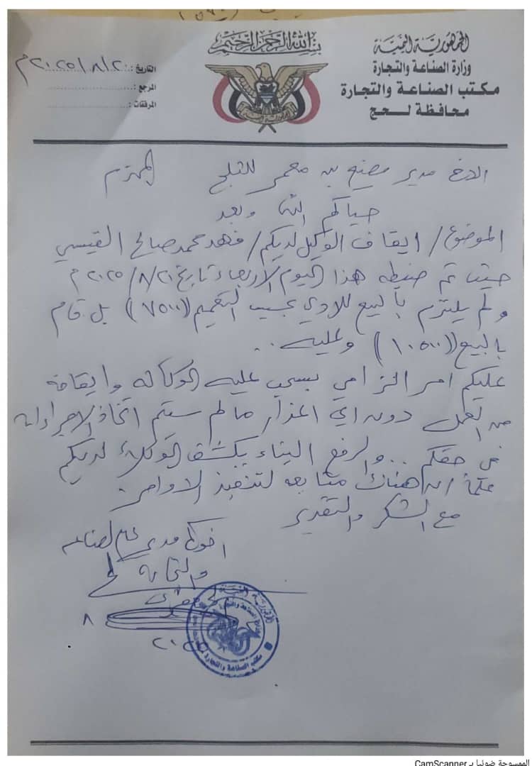 وجه مدير عام مكتب الصناعة والتجارة بمحافظة لحج “عبد الرب الجعفري أمرا إلزاميٱ لمدير مصنع معمر للثلج بضرورة إيقاف الوكيل لديهم فهد محمد صالح القيسي عن العمل وسحب الوكالة منه فورا ودون أي أعذار ما لم ستتخذ الإجراءات في حقهم وذلك لعدم التزامه بالبيع للادي الثلج بالتسعيرة المحددة من قبل المكتب ومخالفته لها وتجاوزه عنها وبأسلوب سافر لا يقبله أحد ..