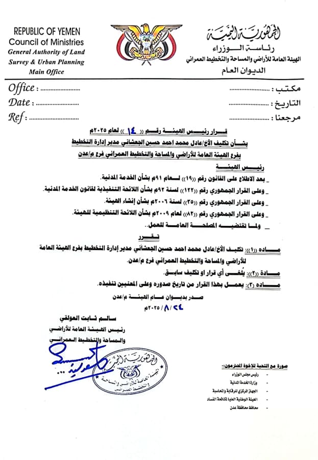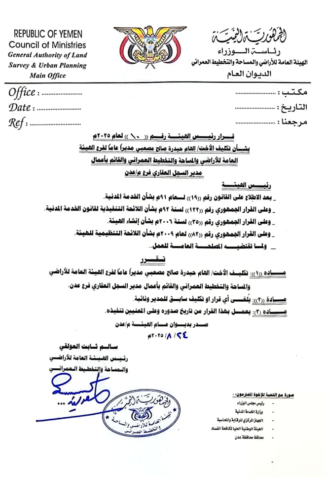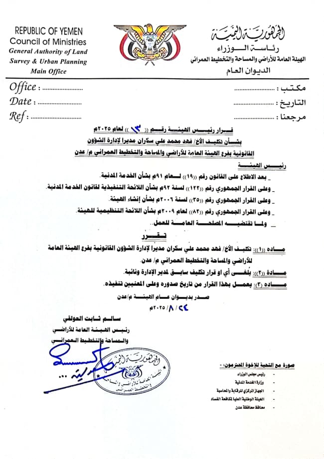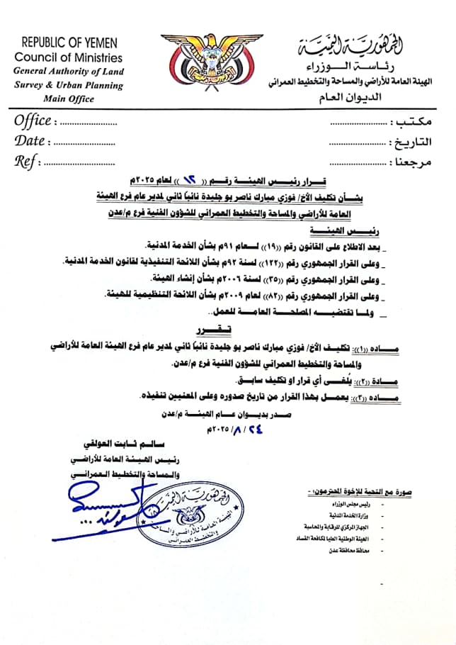 مديرًا عامًا لفرع الهيئة العامة للأراضي والمساحة والتخطيط العمراني بعدن، وقائمًا بأعمال مدير السجل العقاري – فرع عدن.