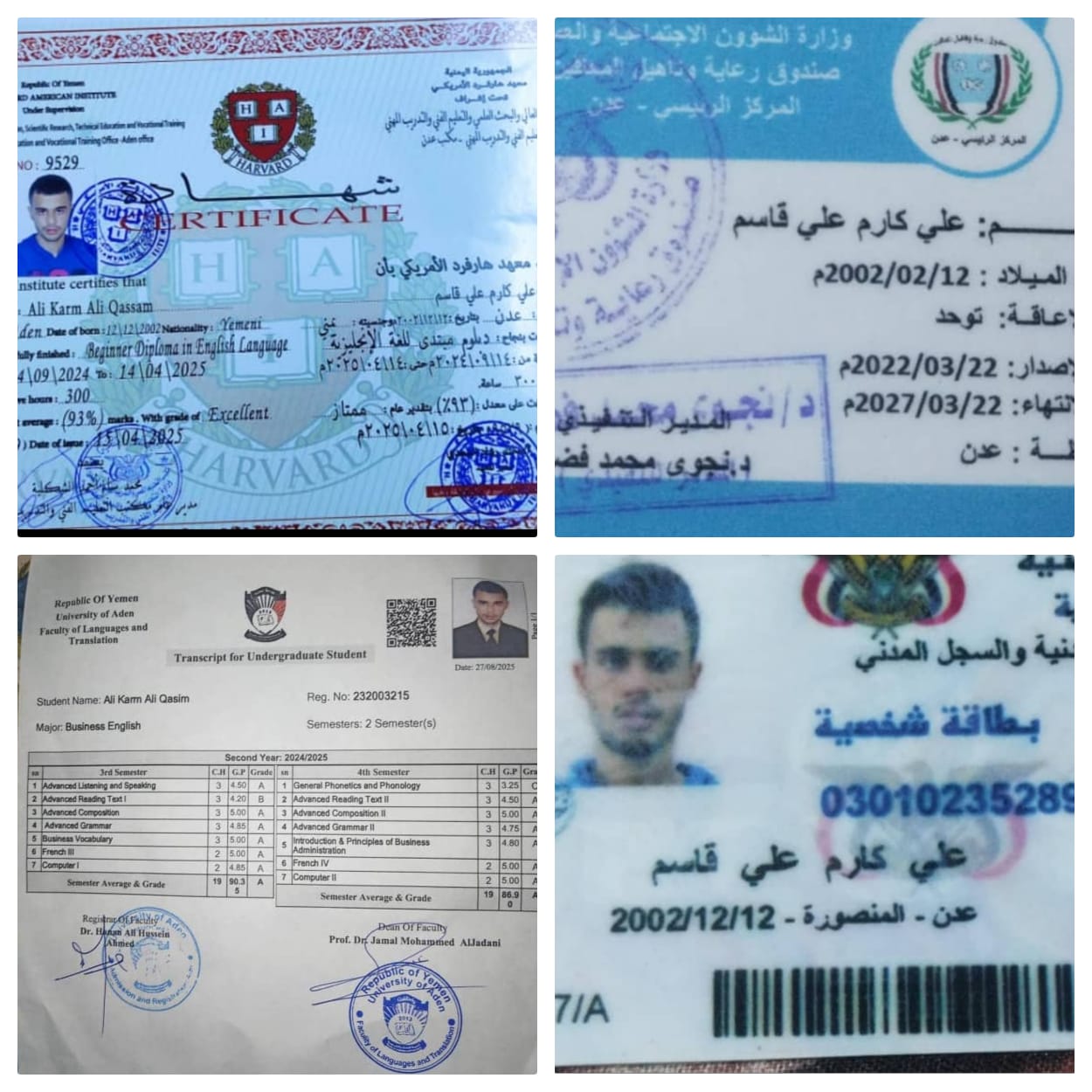 تحدث إلينا الشاب علي كارم، والفرحة تغمره مؤكدا أن ما حققه هو ثمرة صبر أسرته وتشجيعها المستمر إضافة إلى الدعم الذي تلقاه من صندوق رعاية وتأهيل المعاقين – المركز الرئيسي ـ عدن، الذي تكفل بتغطية رسوم دراسته في معهد اللغة الإنجليزية والجامعة . ويضيف علي أنه حاصل على العديد من الشهادات التقديرية لحصوله على المراكز الأولى خلال مراحل التعليم الأساسي والثانوي، وهو اليوم في سنته الثالثة بكلية اللغات – جامعة عدن، و يأمل أن يواصل دراسته العليا في مجال اللغة الإنجليزية التي يحبها بشغف، معتبرًا إياها “لغة العصر” ونافذة للتواصل مع العالم .