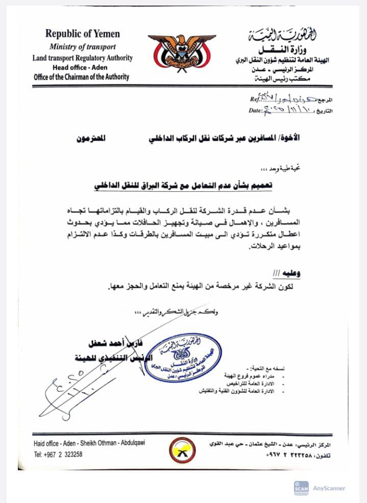 اصدرت الهيئة العامة لتنظيم شؤون النقل البري اليوم تعميمًا للمسافرين عبر شركات نقل الركاب الداخلي حذرت فيه المسافرين من التعامل مع شركة البراق للنقل الداخل.