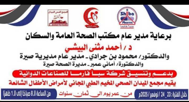 أوضحت الدكتورة أماني عمبر أن المخيم سيقام في مجمع الميدان الصحي بالمديرية.بدعم وتنسيق من شركة سبأ فارما للصناعات الدوائية، وسيستمر لمدة يومين، من 23 إلى 24 نوفمبر 2025. ويهدف المخيم إلى تقديم خدمات طبية مجانية للأطفال المصابين بالأمراض الشائعة، من عمر يوم إلى سن الثامنة. سيشارك فيها نخبة من أطباء الأطفال المختصين لتقديم الفحوصات والتشخيص وصرف العلاج مجاناً.