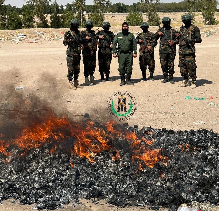 أتلفت قوات الحزام الأمني، اليوم، في العاصمة عدن، كمية كبيرة من حبوب البريجبالين المخدرة المضبوطة من قبل قوات الحزام، والتي بلغت أكثر من (18000) ألف شريط، وما يعادل (271000) حبة بريجبالين، ذو قوة (300)، وذلك بإشراف مباشر من النائب العام، القاضي قاهر مصطفى، والقائد العام لقوات الحزام الأمني، والعميد محسن بن عبد الله الوالي.